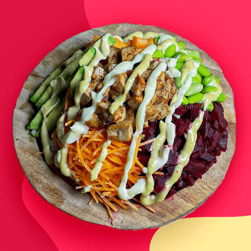 Japanese tofu, avocado, corn, beetroot, carrot, edamame, garlic sauce, spring onions, walnuts.